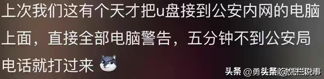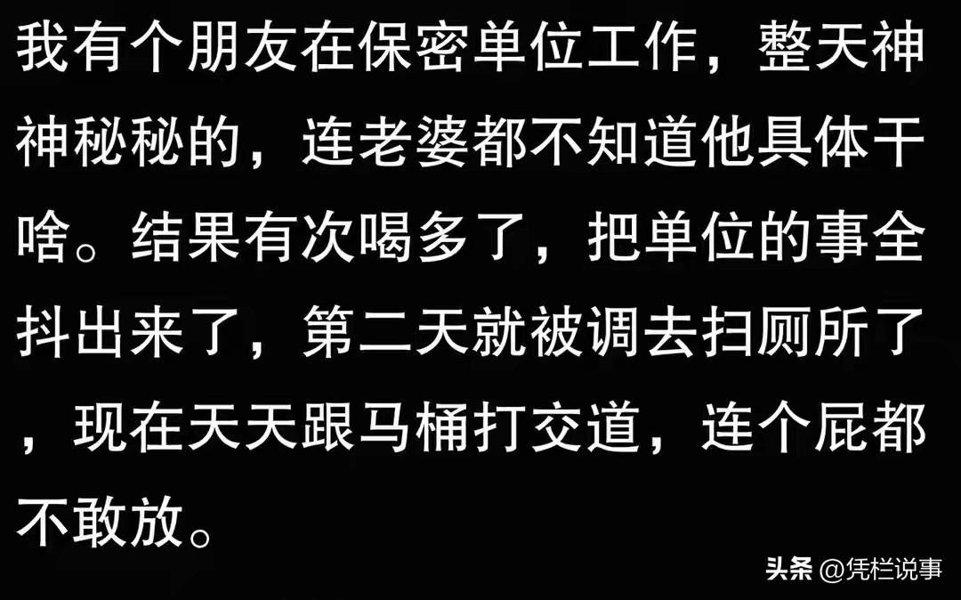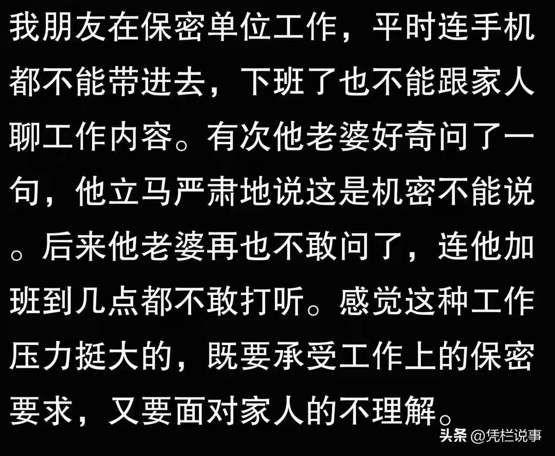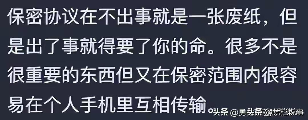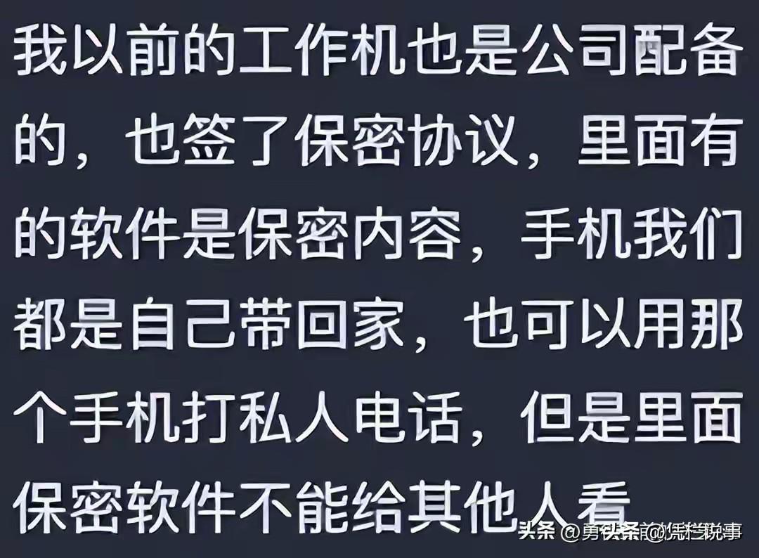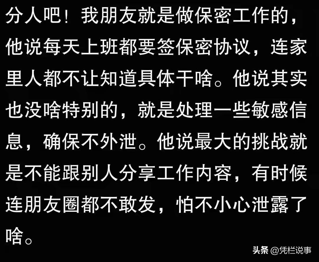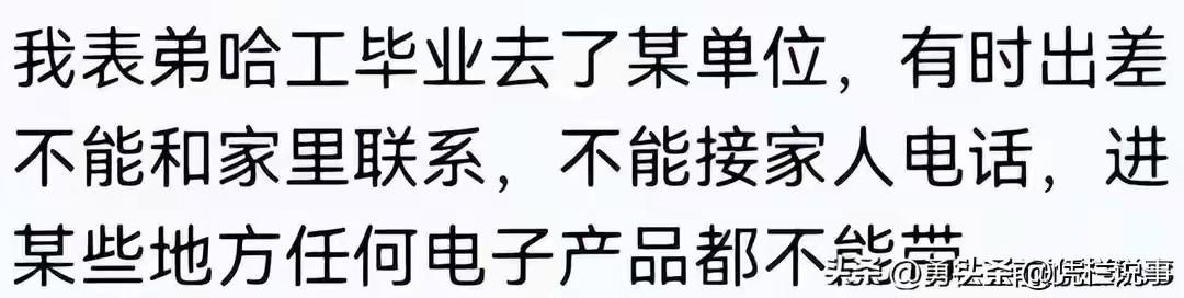 “有个拐弯几处的远亲,考上了警校,上大二的时候,家里来了几个平头黑衣人,无论父母怎样询问,对警校生情况一字不提,只是建议这个亲戚生二胎。”,一位网友评论道。原来有这么多工作需要保密!网友:牺牲12年的爸爸竟然回来了!在这种企业工作,手机肯定不能带进去有没有可能他爸妈是知道的,只是你不知道而已有些东西确实不能乱查手机的所以说那些喝醉乱说话的人最好不要乱喝酒你看...